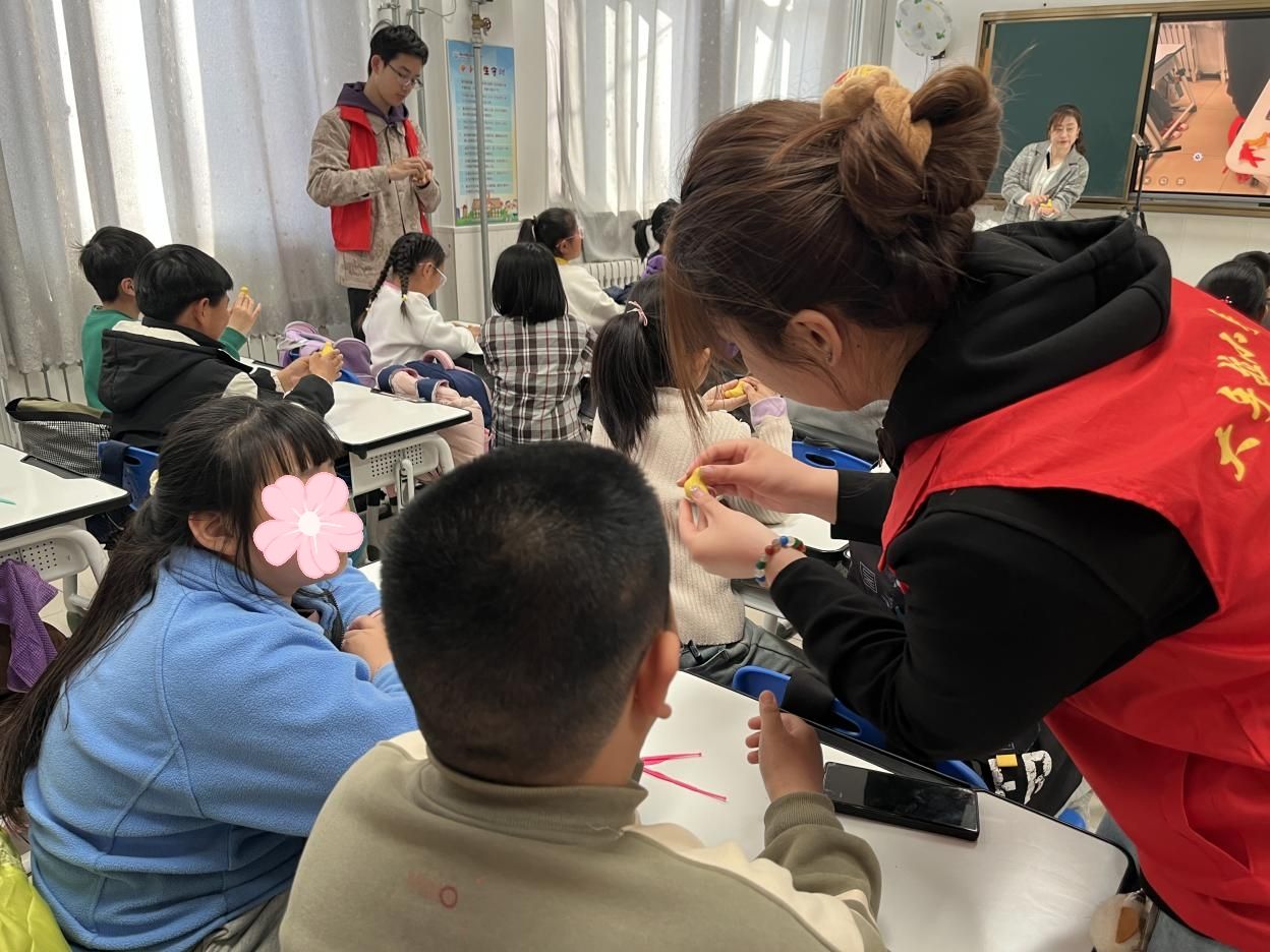 活动当天,微微公益的大学生志愿者携手胶东花饽饽非遗传承人共同走进三年级班级,向孩子们传授花饽饽面塑的基本技巧。从和面、调色到塑形,再到装饰点缀,每一个步骤都细致入微。非遗传承人老师行云流水般的手法让孩子们惊叹不已,激发了他们对胶东花饽饽面塑的浓厚兴趣,眼中充满了对这门古老技艺的好奇与热爱。现场气氛热烈,一双双小手在面团与工具间忙碌,不一会儿,一个个栩栩如生的小燕子花饽饽面塑作品便诞生了。看着自己亲手完成的作品,孩子们脸上洋溢着自豪与喜悦。