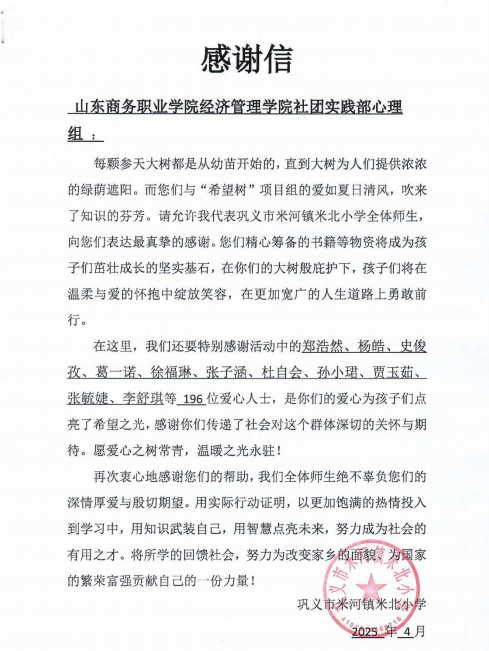 近日,经济管理学院收到来自巩义市米河镇米北小学的感谢信,对学院同学们捐赠书籍、文具等爱心物资表示感谢。