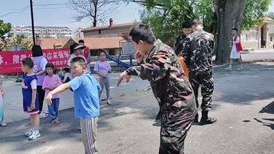 手工活动结束后,先锋连的志愿者组织孩子们练起了军体操。2023年退役复学的候永辉同学是山东商务职业学院先锋连的优秀干事,有当兵经历的他变身“教官”,现场带领孩子们练起了军体操。志愿者们先进行了气势磅礴的军体拳展示,“小兵”们兴奋不已,眼中闪耀着崇拜。之后,先锋连志愿者们进行了一对一教学,孩子们学得有模有样,一旁的大人也看得有滋有味。