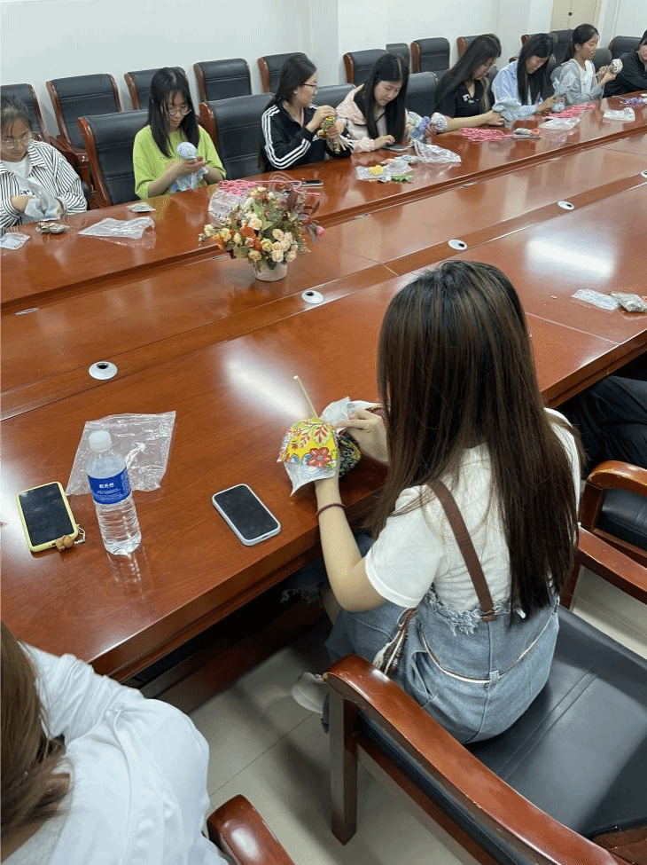 传承传统文化,党建聚力奋进。党员志愿者通过PPT向同学们生动形象的介绍端午节起源、习俗,并制作艾草锤、香囊、五彩绳等传统手工艺品,大家精心挑选艾草等天然香料,认真细致地缝制,将传统节日元素与自己的巧思融入到手工设计中,将端午节的祝福融于香囊之中。
