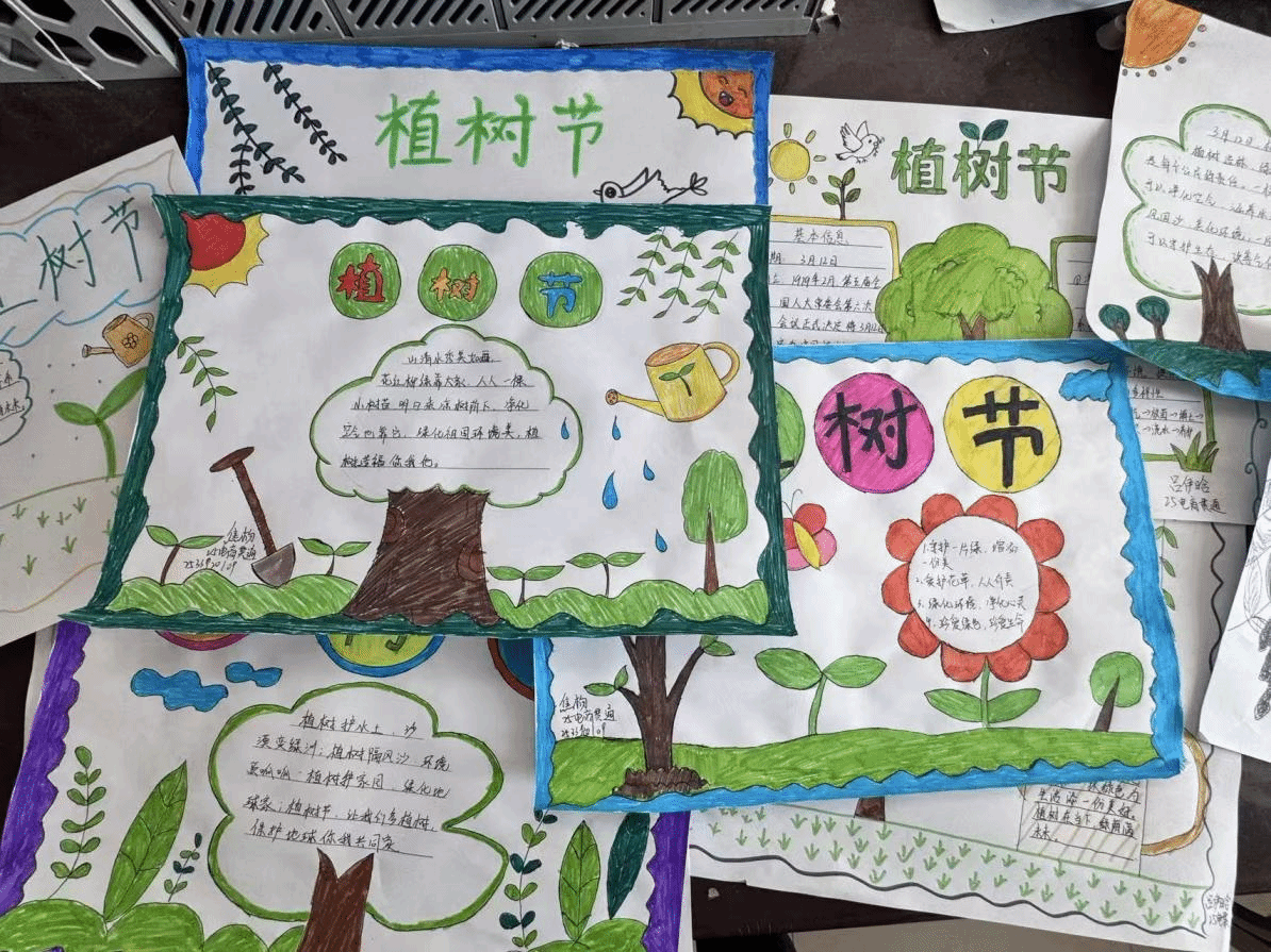 活动前期,同学们以“植树节”为主题,精心创作了形式多样的手抄报作品。同学们用彩笔勾勒出树苗、暖阳、绿叶等春日元素,搭配植树节由来、植树小技巧、生态保护倡议等文字内容,将环保理念融入创意设计中。一张张色彩明快、内容丰富的手抄报,不仅展现了同学们的绘画功底与创作思维,更传递出大家“爱绿、护绿、植绿”的坚定决心,为本次植树节活动营造了浓厚的宣传氛围。