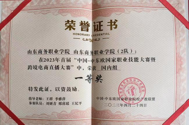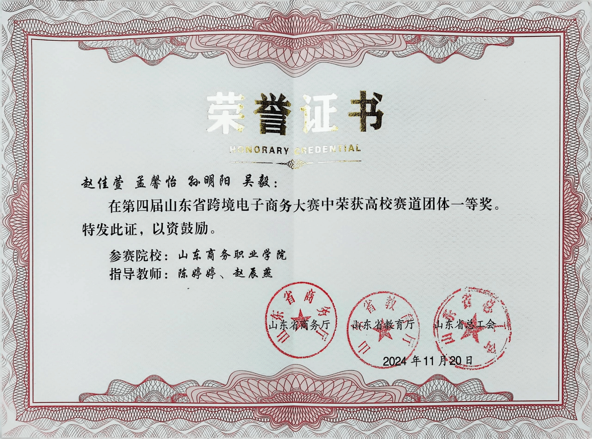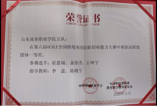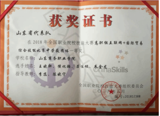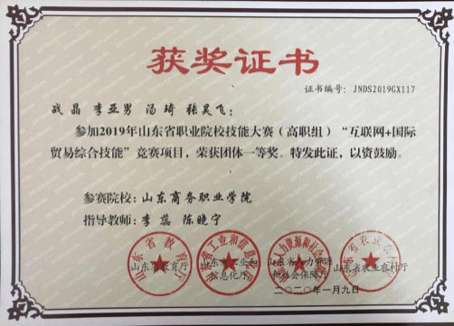 专业教师指导学生参加各级各类大赛多次获奖。获教育部全国职业院校技能大赛高职组“互联网+国际贸易”综合技能大赛一等奖1项、二等奖1项;获山东省职业院校高职组“互联网+国际贸易”综合技能大赛一等奖4项,二等奖1项,三等奖2项;获山东省跨境电子商务技能电商一等奖1项;获全国跨境电商创新创业、跨境电商数据化运营、跨境电商直播等行业技能大赛一、二、三等奖共计30余项;获山东省第十届大学生科技创新大赛铜牌1项,山东省大学生“互联网+”创新创业比赛铜奖1项。