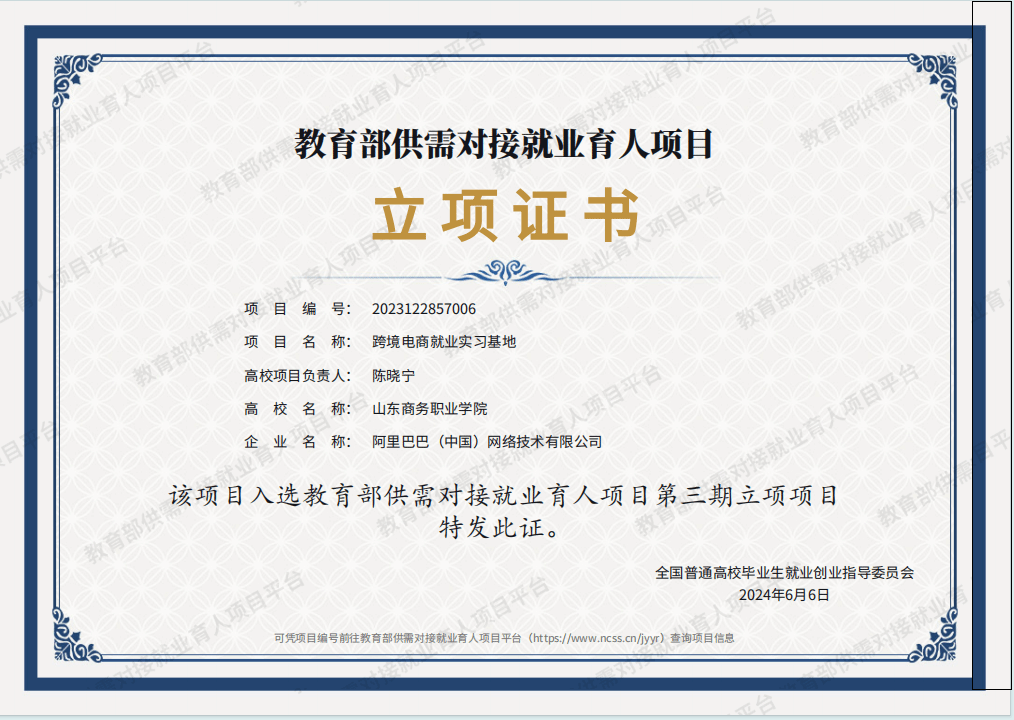山东商务职业学院跨境电子商务专业是教育部1+X跨境电商B2C数据运营和跨境电子商务多平台运营等职业技能等级证书考核试点专业,是全国海丝跨境电商产教融合共同体副理事长单位、全国跨境数字贸易产教融合共同体常务理事单位、山东省跨境电子商务协会高级会员单位。