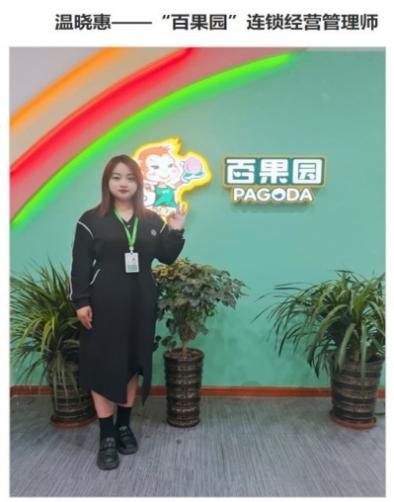 2019级连锁专业毕业生,毕业后入职深圳百果园实业发展有限公司(青岛分公司),半年后,快速晋升为门店店长,经营业绩突出,多次带领门店爆破青岛区域业绩第一名;2020年3月,升为区域经理,进入运营部,成为青岛区最年轻的管理层干部,目前,主管烟威青区域加盟业务。