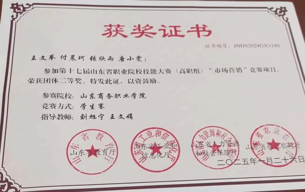 本专业2025级大一新生,入学不足半年便在第十八届山东省职业院校技能大赛中斩获铜奖,展现出扎实的专业功底与出色的实操能力。本专业坚持岗课赛证融通、技能培养前置的育人特色,将实操训练融入日常教学,以理实一体化、实景化实训夯实技能根基,把省级大赛标准与岗位核心能力深度对接。新生短时间内便能站上省级赛场摘得荣誉,充分彰显专业重技能、强实操、快成才的培养特色。