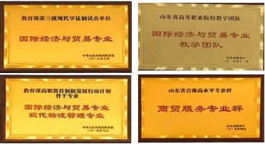 本专业是山东省高水平专业群建设骨干专业,先后获评教育部、山东省现代学徒制试点专业、教育部创新行动计划骨干专业、跨境电商B2B数据运营职业技能等级证书试点专业、教育部供需对接定向人才项目承担专业、山东省特色专业、山东省教学创新团队。参与山东省国际经济与贸易专业教学标准的修订,在2023年山东省高等职业院校国际经济与贸易专业考核中,排名全省第一。