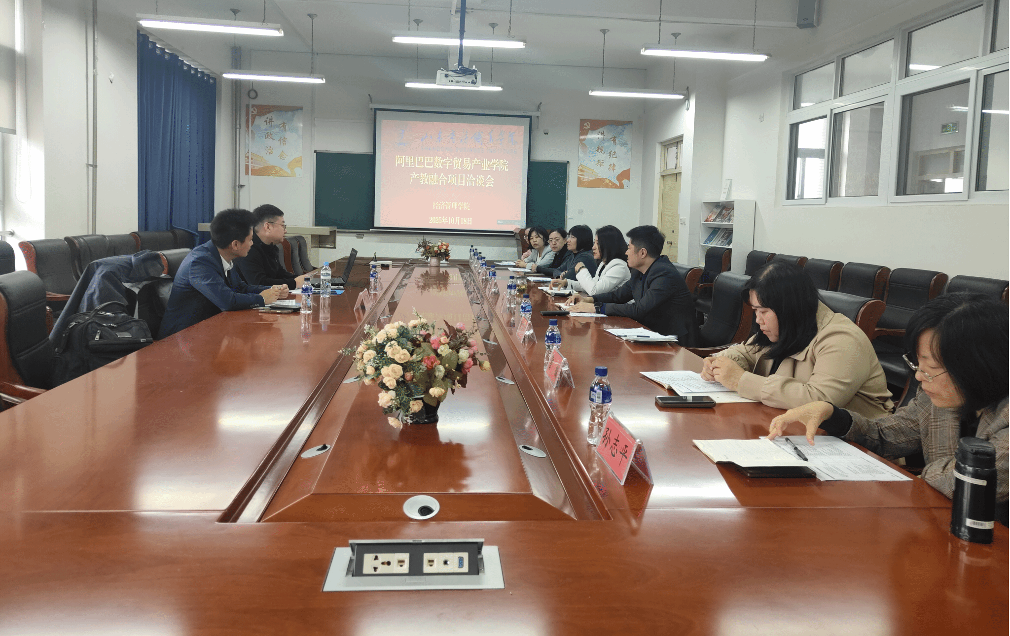 10月18日下午,经济管理学院与阿里巴巴国际数字商业集团在一体化教学楼A311会议室举行数字贸易产业学院产教项目专题洽谈会。阿里巴巴国际数字商业集团公共事务副总经理熊弢、阿里巴巴全球数字人才教育联盟秘书长王振彬,经济管理学院党总支书记范彩荣、院长刘晓军、副院长李蕊及各专业带头人共同出席会议,围绕产业学院建设核心议题展开深度研讨,为数字贸易产业学院建设与数字贸易人才培养有效落地破题献策。