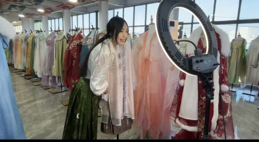 地处于曹县的一号云仓是本地最大的汉服批发基地,学习实践过程中,师生详细参观了该汉服基地。本次实践以助力曹县汉服文化传播和汉服销售为主导,包括现场直播、短视频作品等,学生先后参观了本地最大的汉服批发基地一号云仓,随后展开岗位锻炼。在带队老师和企业现场人员的指导下,学生从选品、直播设备调整、直播活动开展等方面,为观众呈现了一场场精彩纷呈的直播。