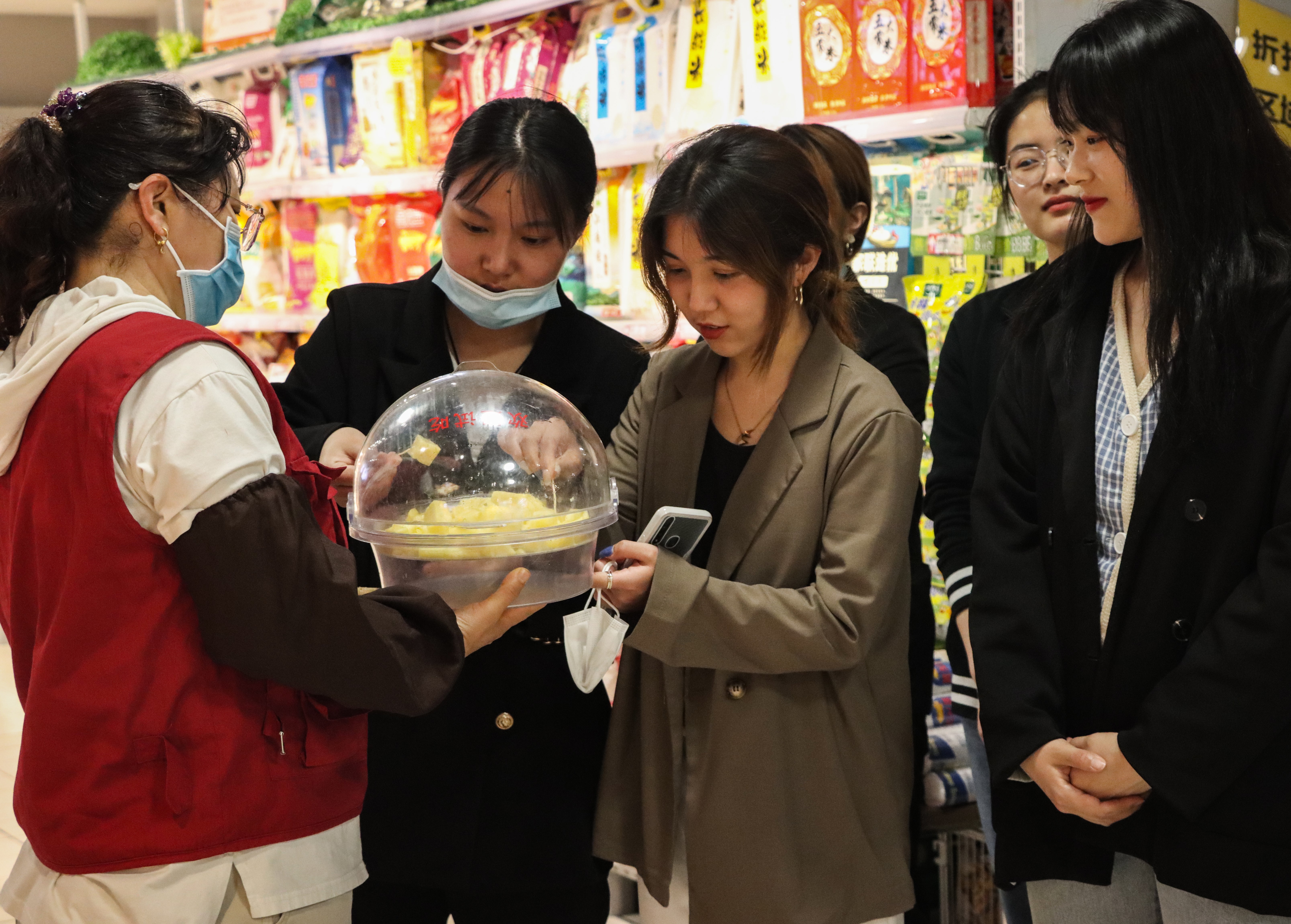 同学们到达后受到门店店长和人力资源部宫经理的热烈欢迎,随后学生们在宫店长的带领下对门店进行参观与介绍。宫店长以通俗易懂的方式对每个零售区域产品的陈列方式和陈列原则作了十分详细的介绍,并结合家家悦万达店周围的顾客群体与商圈特征,引导学生思考、讨论如何选择主推商品,如何进行堆头设计等。同时,引导学生对店内环境设计进行关注。宫店长介绍说,企业要越来越注重顾客的购物感受,不断提供时尚、舒适的购物环境,周到热情地服务,优质有特色的产品。学生们在参观的同时,结合自己门店管理所学理论知识,与店长进行积极的提问交流,气氛十分活跃。