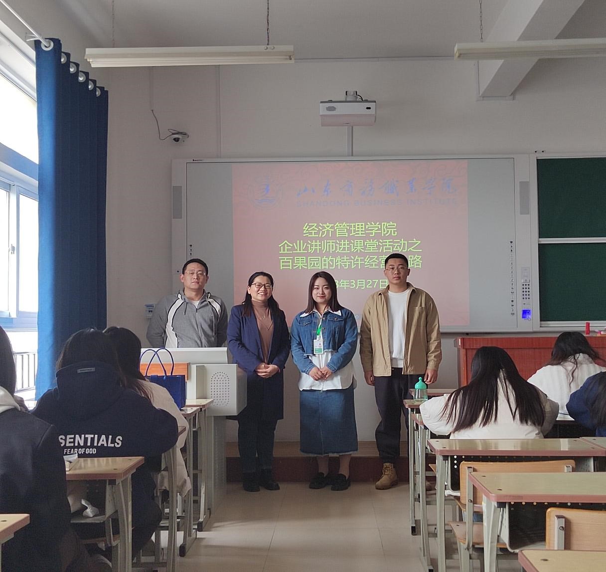 为贯彻落实职业教育工作会议精神,深化产教融合、校企合作,提高人才培养质量,经济管理学院积极探索职业教育校企“双导师”协同育人机制。秉承“请进来、走出去“的原则,2023年3月27日,经济管理学院连锁经营与管理专业邀请青岛百果园食品有限公司企业加盟部负责人温晓惠,参与到连锁专业核心课程《特许经营管理》的课堂教学中,为2021级连锁经营与管理专业学生上了一节生动的“特许加盟模式在企业的实践操作”课。《特许经营管理》授课教师王羽、教研室教师孙寒冰以及2021级连锁专业3班全体学生参加了本次教学活动。