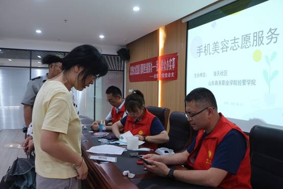 活动当日温度较高,经济管理学院教师党支部党员教师不惧酷暑,热心向社区群众提供免费手机清洗、贴膜、更换手机电池等服务。党员教师身穿志愿者红马甲,拿着专业的手机清洗工具、贴膜装备和拆机工具等,让社区群众的手机屏幕更加清楚,接打电话声音更加清晰。志愿活动中,党员教师热情高涨、干劲十足,充分发挥了党员的先锋模范作用,受到海天社区群众的好评。