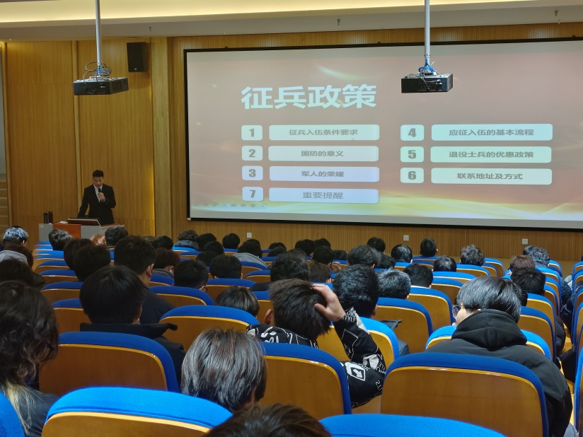 举行征兵宣讲会,深度解读征兵政策。在征兵宣讲会上同学们认真听取了征兵入伍政策解读。首先是征兵入伍的条件要求,包括年龄、体格、学历等方面的要求及征兵入伍的基本流程和报名时间。其次,关于服役期限和优待政策。大学生退役士兵享受学费减免或补偿,家庭经济困难的退役士兵在校享有国家助学金。此外,表现优秀的义务兵还可以获得嘉奖、立功等荣誉。