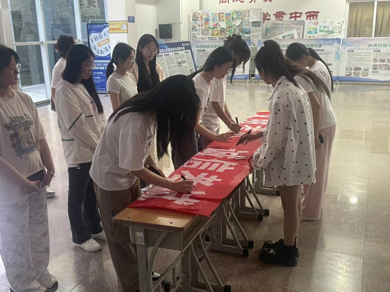 诚信签名,青春誓言,共筑诚信校园。组织诚信签名活动,红色条幅上印有“文明考风,诚信考试”字样,老师首先向同学们强调了诚信的重要性,随后组织同学们在条幅上郑重签下自己的名字,以此表达对诚信的承诺和追求。通过集体签名的方式,进一步弘扬诚信精神,提升学生的诚信意识。