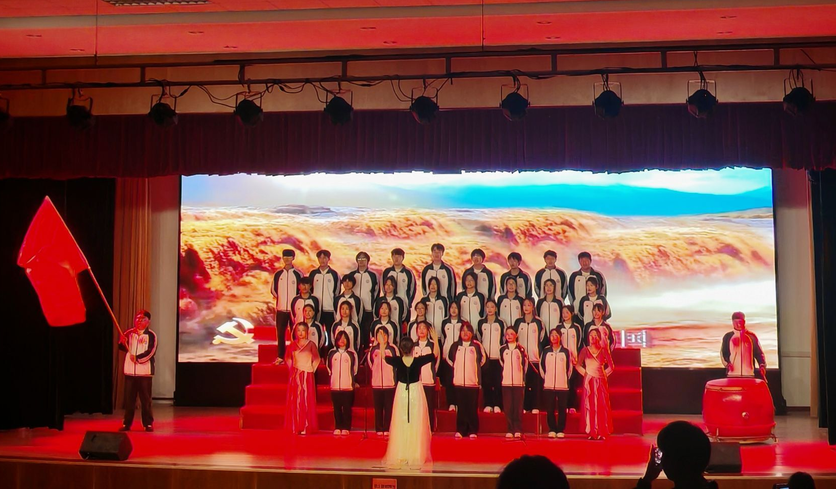随着指挥的手势扬起,从《大中国》《我爱你中国》,再到《保卫黄河》,经管学子用青春的嗓音诠释着红歌的内涵,每一个音符都充满力量,现场观众沉浸在歌声的海洋中,感受着革命先辈们的奋斗精神和爱国情怀。