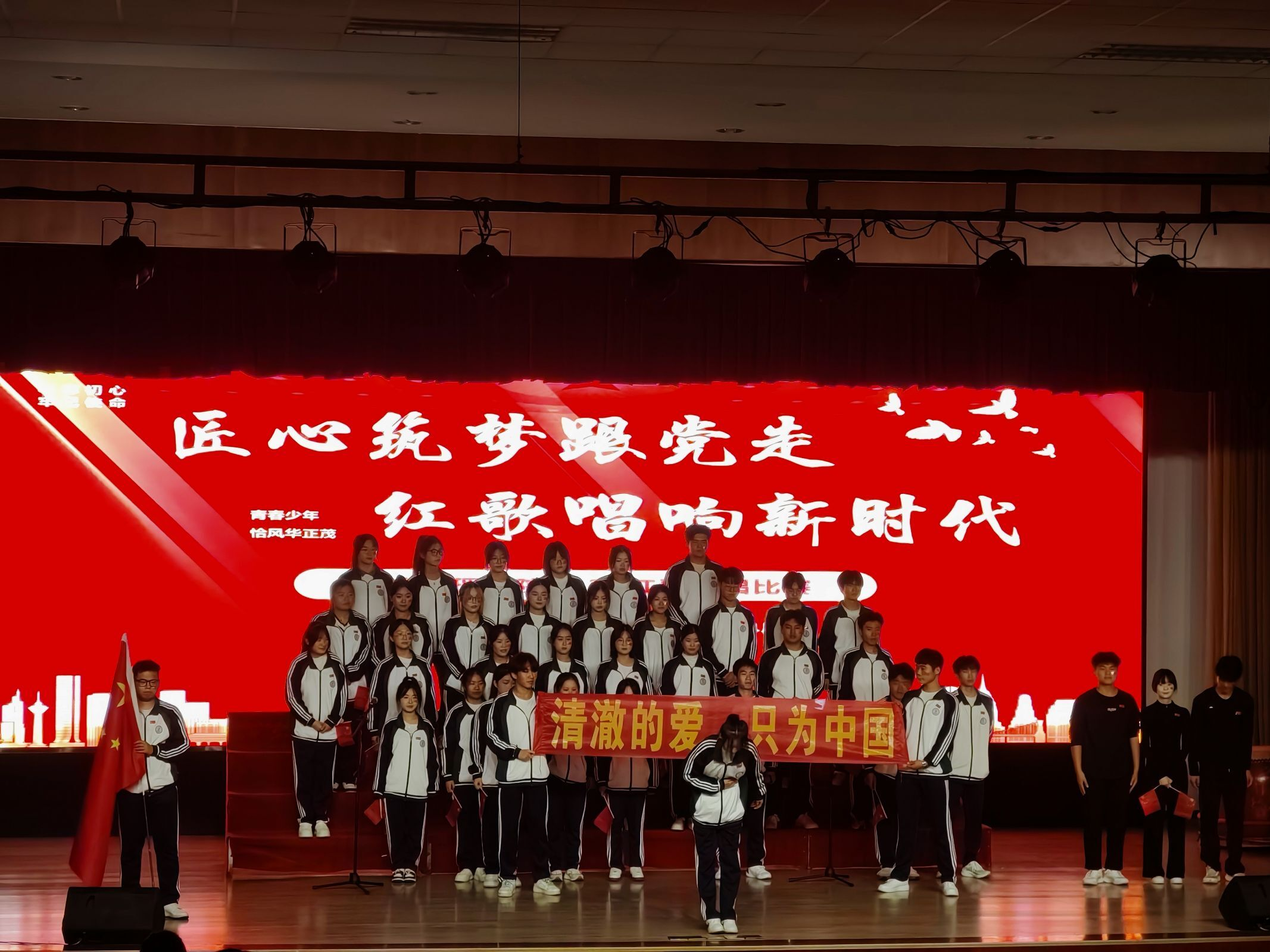 比赛现场,学院16个新生班组成16支队伍齐聚一堂,共同奏响一曲曲红色时代华章,他们用嘹亮的歌声向经典致敬,为现场观众带来了一场精彩的视听盛宴。