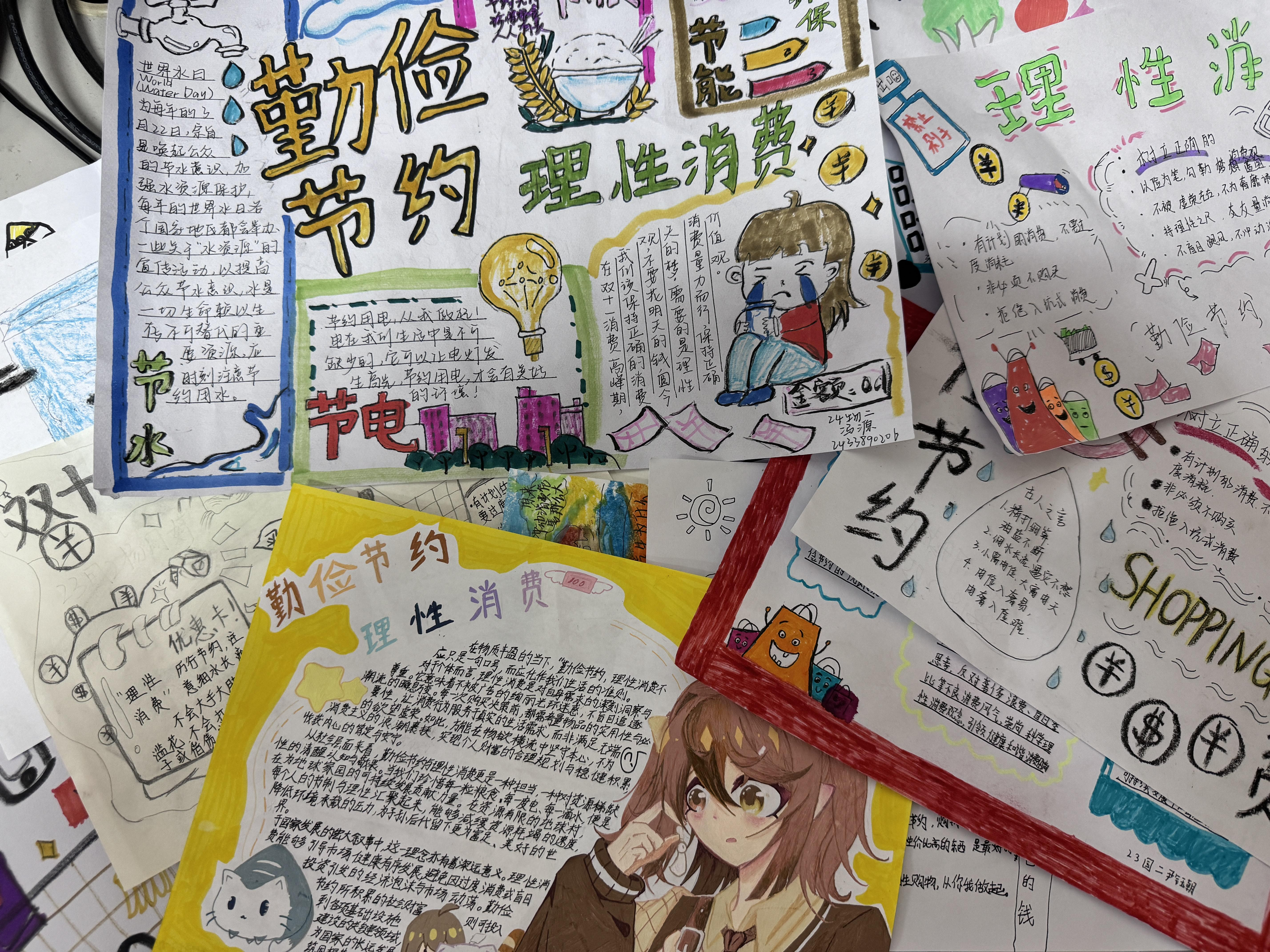 开展“勤俭节约,理性消费”主题手抄报活动,创作过程中,同学们充分发挥自己的想象力和创造力,以画笔和文字表达自己对勤俭节约、理性消费的感悟。一幅幅色彩斑斓、内容丰富的手抄报作品,不仅体现了同学们扎实的绘画功底,更展现了他们对勤俭节约、理性消费这一主题的深刻认识。